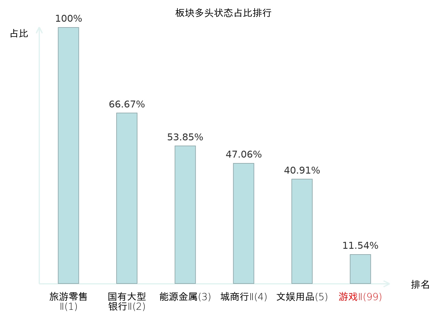 全市场所有行业板块中主力多头状态占比排名中,旅游零售Ⅱ板块位居第一。保险Ⅱ板块名次提升最快,较昨日上升57位。