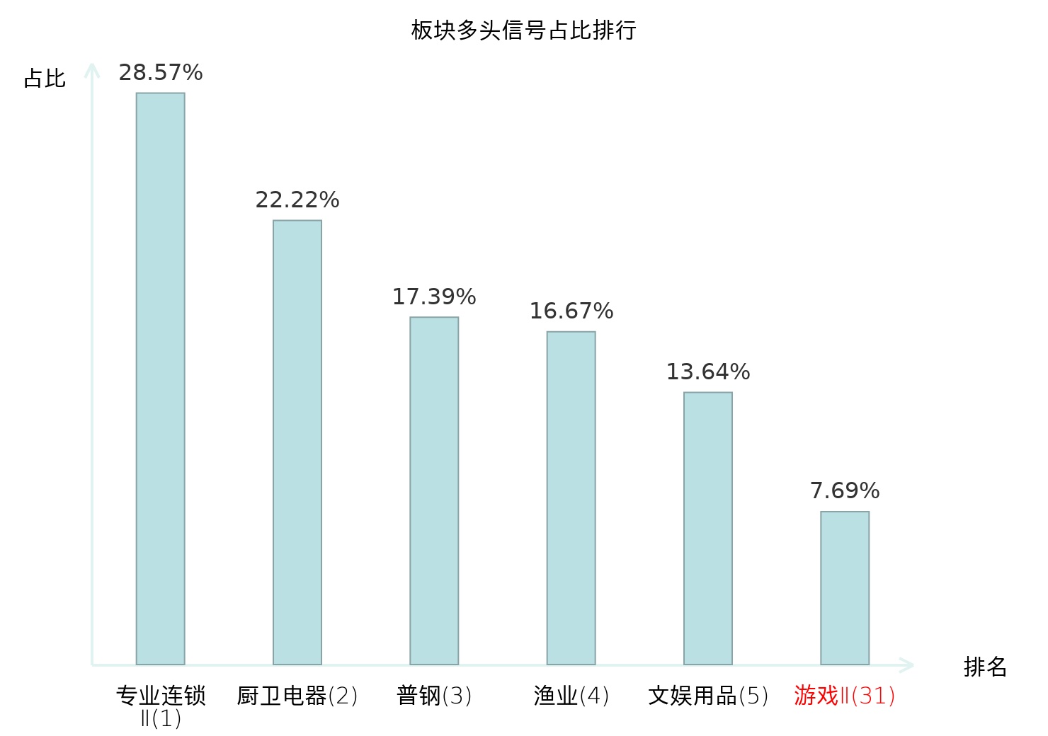 全市场所有行业板块中主力多头信号占比排名中,专业连锁Ⅱ板块位居第一。专业连锁Ⅱ板块名次提升最快,较昨日上升120位。
