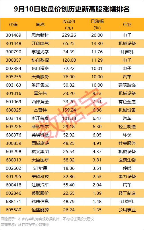 收盘价创历史新高股中,今日股价平均上涨6.05%,涨停的有思泉新材、东山精密、圣晖集成等,涨幅居前的有开创电气、宇瞳光学、协创数据等。
