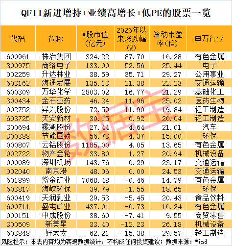 估值水平方面,数据宝统计,截至4月24日收盘,上述135只业绩高增长的QFII新进增持股中,滚动市盈率(PE)低于30倍的有21只。8股滚动市盈率不到20倍,包括中成股份、云铝股份、紫金矿业、节能国祯、盛屯矿业、株冶集团、海峡环保、昇兴股份。