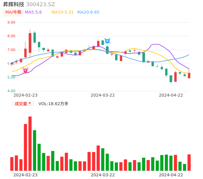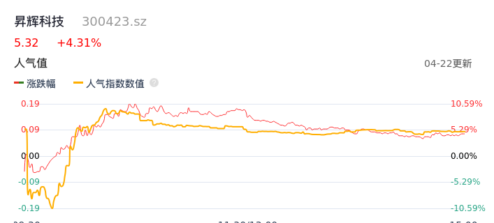 04月22日,昇辉科技收报5.32,股价涨幅4.31%,成交金额9976.83万元,换手率5.74%。