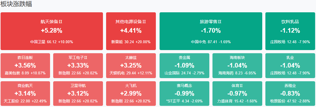 市场早盘窄幅震荡,三大指数集体翻红。黄白两线严重分化,中小盘股表现较强。沪深两市半日成交额1.15万亿,较上个交易日缩量895亿。盘面上热点快速轮动,全市场超3800只个股上涨。从板块来看,商业航天概念持续走强,近20只成分股涨停,其中超捷股份20cm涨停,神剑股份5连板,九鼎新材、合众思壮、再升科技涨停。福建板块再度走强,安记食品7天4板,合兴包装3连板。半导体板块表现活跃,圣晖集成3连板。下跌方面,贵金属概念高开低走,山金国际、西部黄金下挫。乳业概念回调,庄园牧场触及跌停。