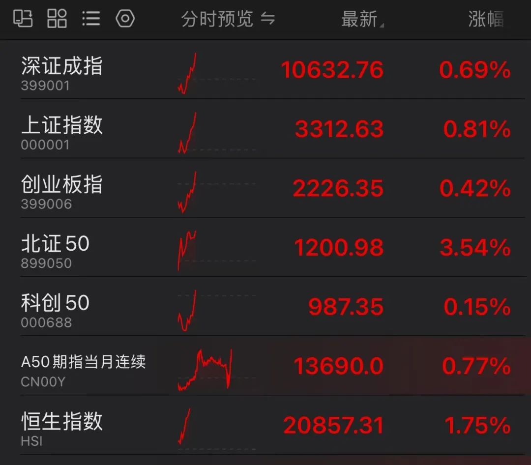10月23日早盘,A股低开高走。北证50继续领涨,截至发稿最新涨幅为3.54%。港股持续拉升,恒生指数上涨1.75%。