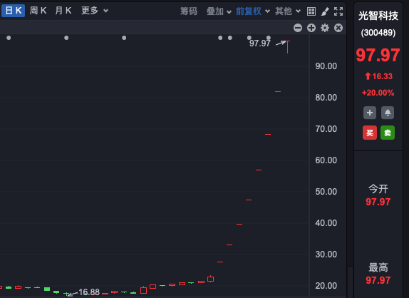 八连板的光智科技,目前最新总市值为135亿元,在行情启动之前总市值仅30亿元左右。但光智科技此前公告,拟收购估值超200亿元的“独角兽”企业先导电科。