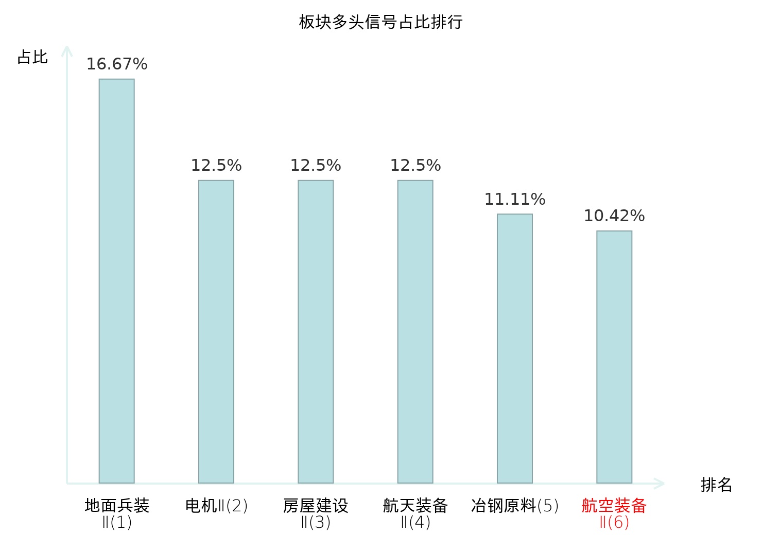 全市场所有行业板块中主力多头信号占比排名中,地面兵装Ⅱ板块位居第一。房屋建设Ⅱ板块名次提升最快,较昨日上升115位。