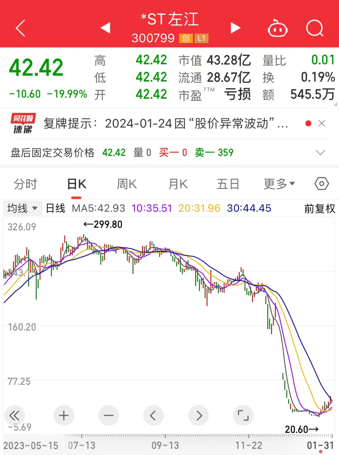 历史数据显示,2023年5月4日,*ST左江被实施退市风险警示,股票简称由“左江科技”变更为“*ST左江”。在公司“披星戴帽”后,股价不跌反涨,一路走高,最高达299.8元/股(前复权),成为史上最贵ST股。截至目前,公司收盘价较历史高点回撤85.85%。
