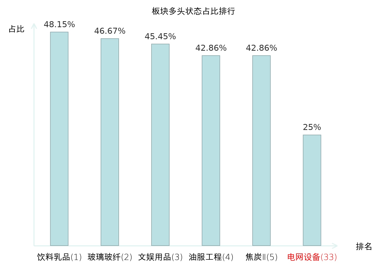 全市场所有行业板块中主力多头状态占比排名中,饮料乳品板块位居第一。商用车板块名次提升最快,较昨日上升77位。