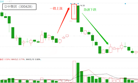 如下图所示,个股立中集团于7月26日出现T字线K线形态,出现该形态之后,该股一路上涨,股价从10.74元涨到14元,涨幅高达30.4%!见顶信号已出现,此时应卖出持有的股票,离场观望。