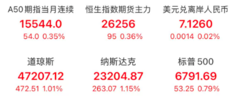 纳斯达克中国金龙指数收涨0.27%,A50指数上涨0.35%,恒生指数期货主力上涨0.36%。