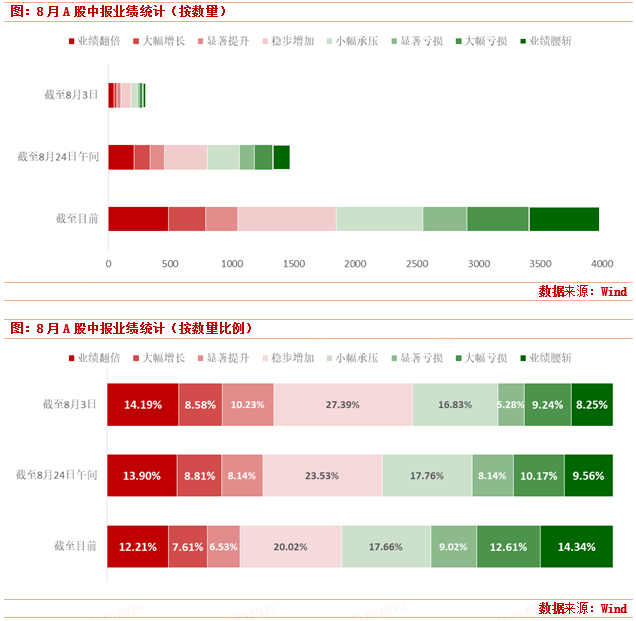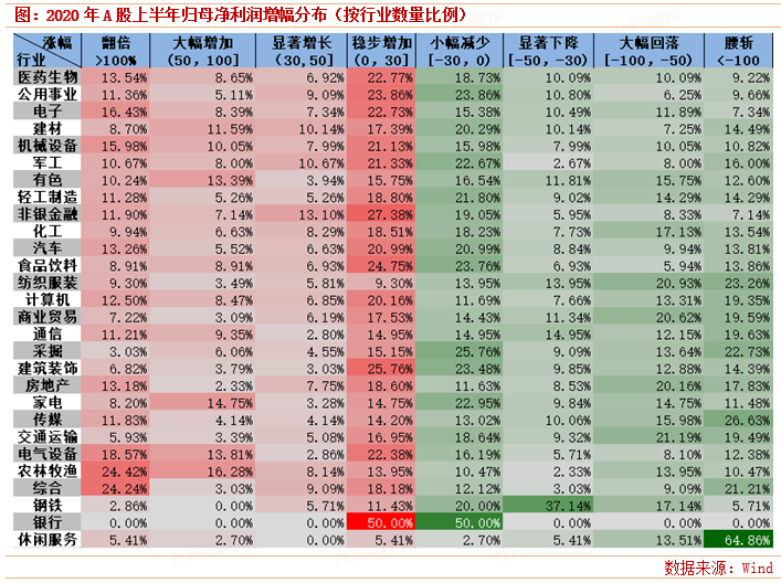 综合8月A股上市公司的中报发布全过程,2020年A股中报季仍然遵循着“好日子先过”的特征。数据显示,截至8月3日,A股共有303家上市公司正式公布上半年业绩,其中有65.83%的公司实现业绩增长、14.19%的公司业绩翻倍、8.25%的公司业绩腰斩。截至8月24日午间收盘,已公布中报业绩的1475家公司中录得归母净利润同增的企业比例只有54.86%;业绩翻倍/腰斩的个股分别占总数的13.9%和9.56%,相比8月初的数据分别提升了-0.29和+1.31个百分点。