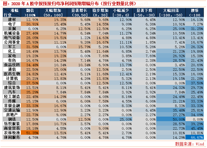 统计显示,在所有行业中,剔除没有公布任何预报的银行以外,85%的行业上半年实际录得归母净利润同比下降的个股比重超过预报。其中,中报亏损比例超过预报预亏比例20个百分点以上的行业共计9个:非银金融、国防军工、建筑装饰、汽车、房地产、家用电器、交通运输、轻工制造和农林牧渔。