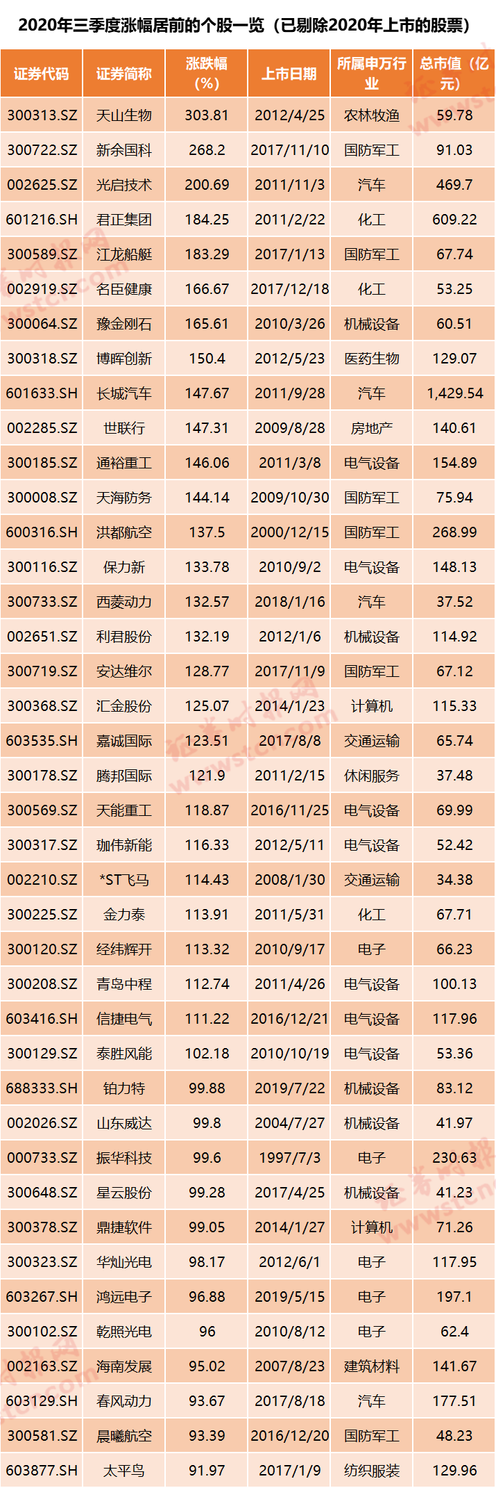 具体个股上,剔除2020年上市的次新股后,三季度有2375只个股上涨,占到相应个股总数的六成以上,其中208股涨幅超过50%。涨幅居前的个股既有市值不足50亿元的小盘股,也有不少市值数百亿,乃至过千亿的股票,如长城汽车三季度就大涨147.67%,目前市值已达1429.54亿元。
