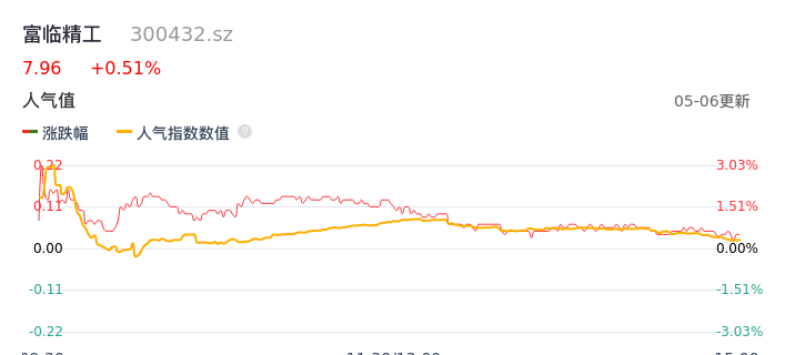 05月06日,富临精工收报7.96,股价涨幅0.51%,成交金额1.66亿元,换手率1.71%。