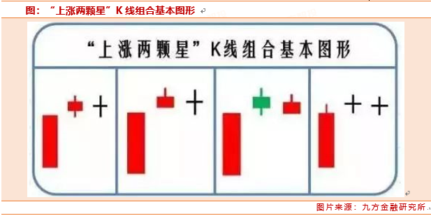 首先,收出一根实体较长的大阳线或中阳线,代表“上涨”。随后,在大阳线的上方出现两根并排实体较小的K线,代表上涨之后的“两颗星”。