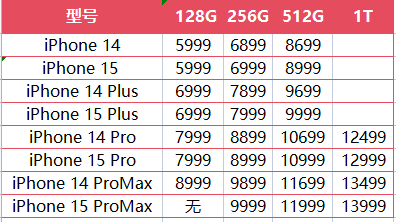 值得一提的是,华为Mate60系列提前半个月开售一片火热之际,苹果此次竟然涨价了,iPhone15系列除ProMax外起售价均未变,256G、512G、1T版本单价分别上涨100元、300元、500元,iPhone15ProMax取消了128G版本,256G售价9999元/部,全系5999元-13999元。
