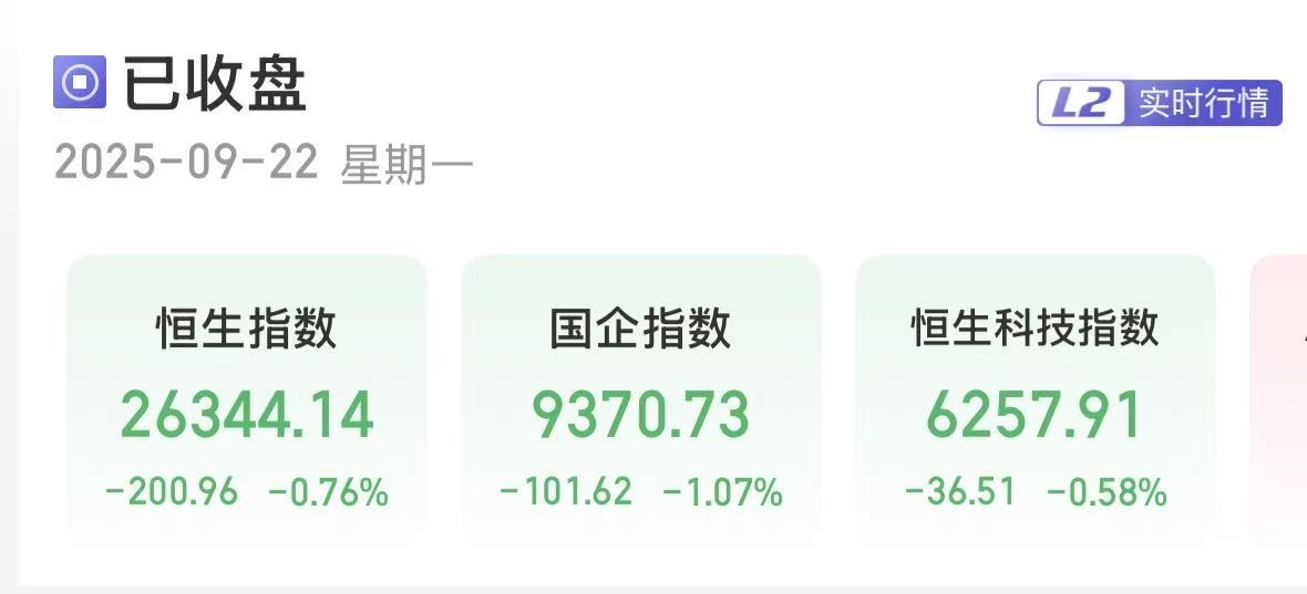 上证报中国证券网讯 9月22日,港股三大指数集体收跌。截至收盘,恒生指数跌0.76%,报26344.14点;恒生国企指数跌1.07%,报9370.73点;恒生科技指数跌0.58%,报6257.91点。