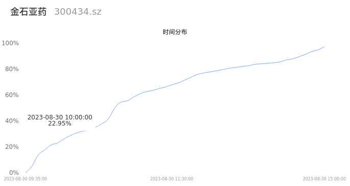 300434金石亚药2023年08月30日成交11.38万手,成交金额1.35亿元,相较昨日放量1.13万手,换手率3.38%,成交清淡。