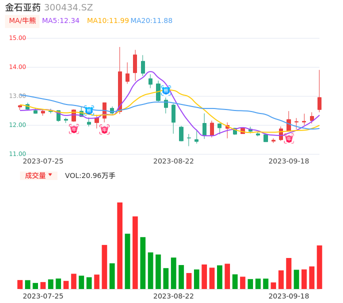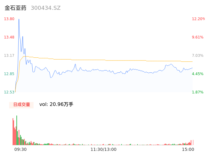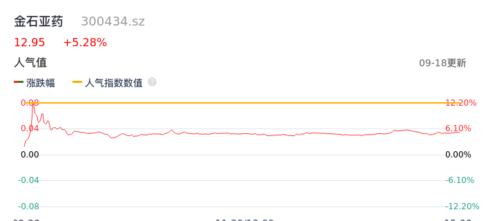 09月18日,金石亚药收报12.95,股价涨幅5.28%,成交金额2.74亿元,换手率6.23%。