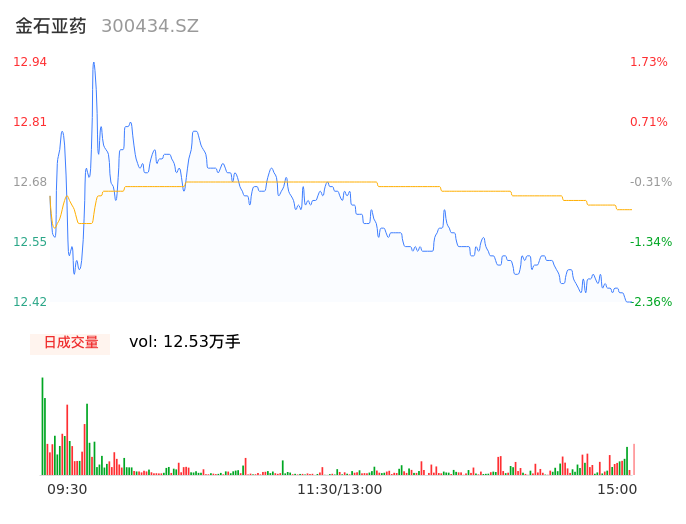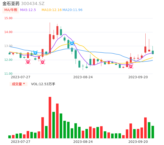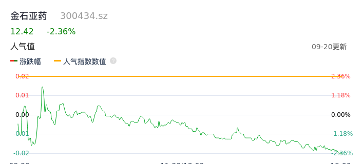 09月20日,金石亚药收报12.42,股价涨幅-2.36%,成交金额1.58亿元,换手率3.72%。