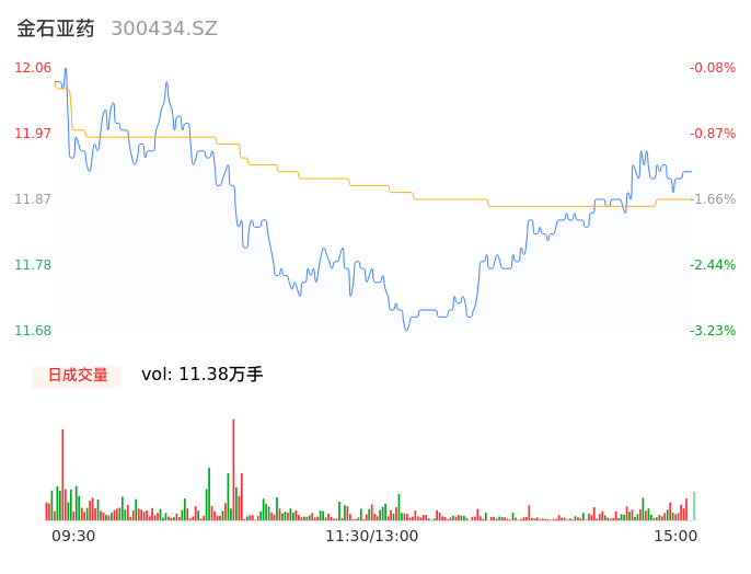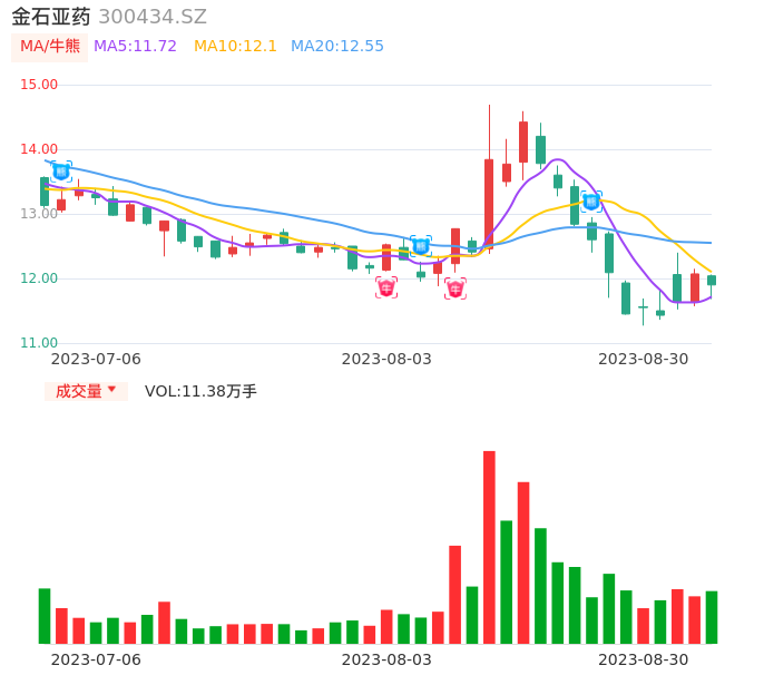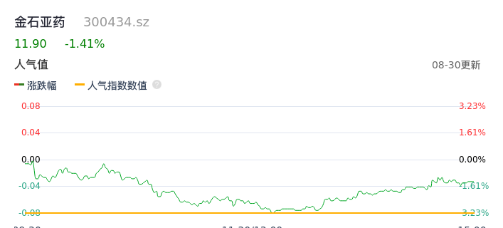 08月30日,金石亚药收报11.90,股价涨幅-1.41%,成交金额1.35亿元,换手率3.38%。