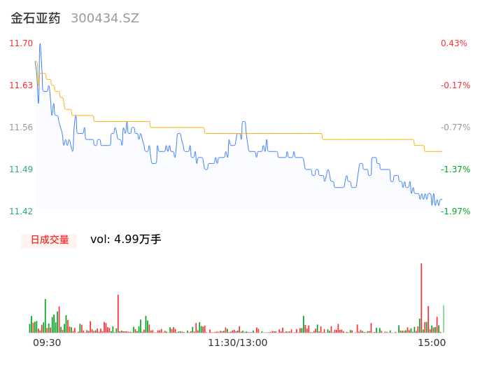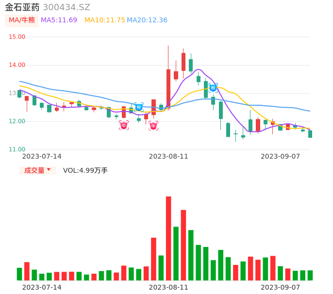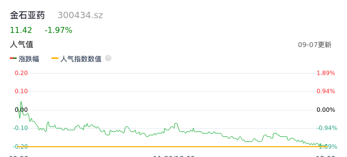 09月07日,金石亚药收报11.42,股价涨幅-1.97%,成交金额5747.60万元,换手率1.48%。