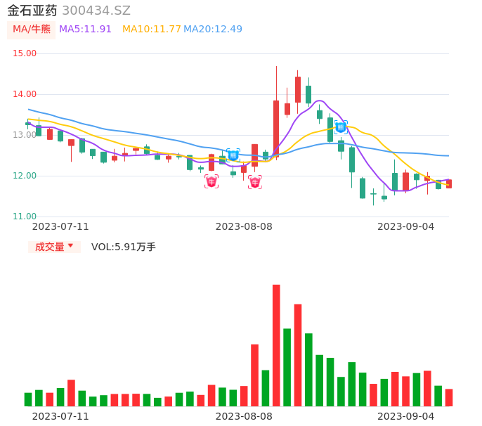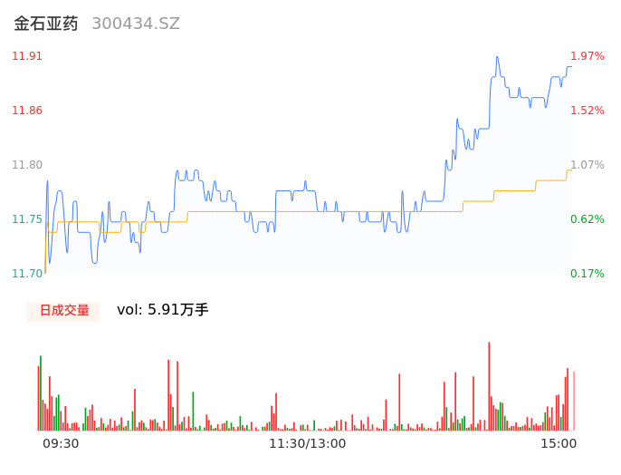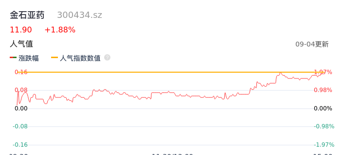 09月04日,金石亚药收报11.90,股价涨幅1.88%,成交金额6971.32万元,换手率1.76%。