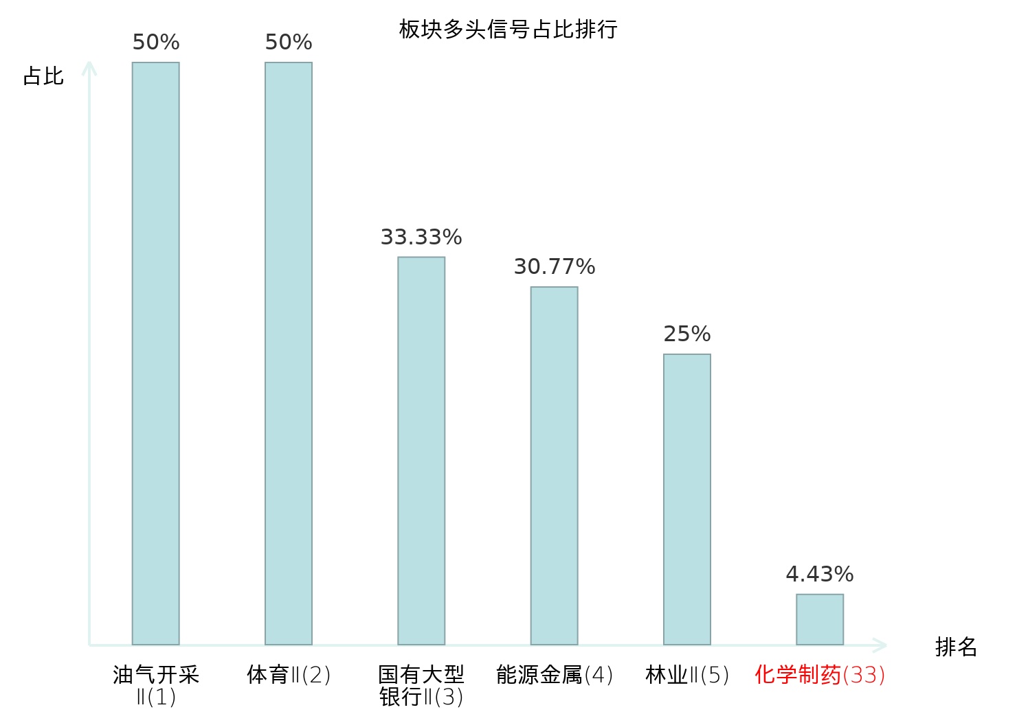 全市场所有行业板块中主力多头信号占比排名中,油气开采Ⅱ板块位居第一。体育Ⅱ板块名次提升最快,较昨日上升129位。