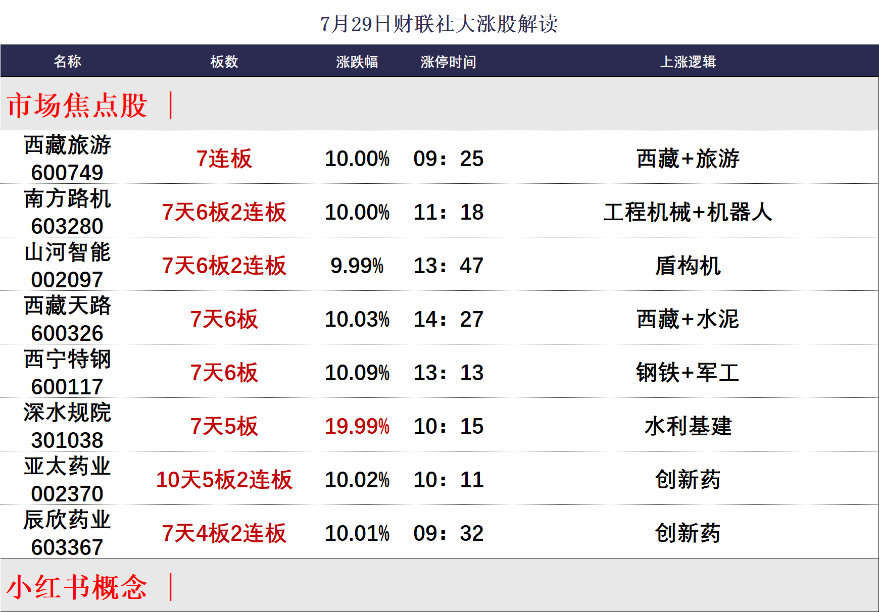 财联社7月29日讯,今日43股涨停,22股炸板,封板率为66%,西藏旅游7连板,山河智能、西藏天路、南方路机、西宁特钢7天6板,深水规院20cm7天5板,亚太药业10天5板,辰欣药业7天4板。市场全天震荡走高,创业板指领涨。沪深两市全天成交额1.8万亿,较上个交易日放量609亿。盘面上,市场热点较为杂乱,个股跌多涨少,全市场超3000只个股下跌。板块方面,CRO、钢铁、CPO、先进封装等板块涨幅居前,保险、猪肉、银行、农业等板块跌幅居前。截至收盘,沪指涨0.33%,深成指涨0.64%,创业板指涨1.86%。