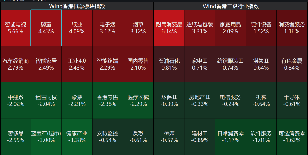 板块方面,智能电视、婴童概念强势领涨,纸业、电子烟等消费制造板块集体走强,耐用消费品、硬件设备等板块表现活跃;下跌方面,健康产业、奢侈品等高端消费方向普遍调整,中建系、租售同权等地产相关概念同步走弱。