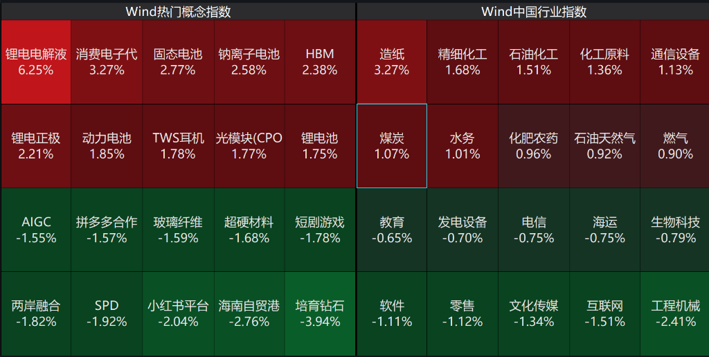 盘面上,个股涨跌互现,今日成交逾1.72万亿。板块方面,锂电电解液概念强势领涨,涨幅超6%;消费电子代工、固态电池、钠离子电池等新能源相关板块集体走强;造纸、精细化工等周期板块表现活跃。下跌方面:软件、互联网、文化传媒等科技应用方向普遍调整;海南自贸港、两岸融合等区域概念同步走弱。