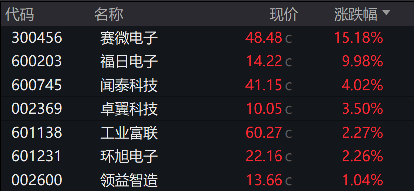 消费电子领涨,赛微电子收涨超15%,福日电子接近涨停,闻泰科技、桌翼科技跟涨。