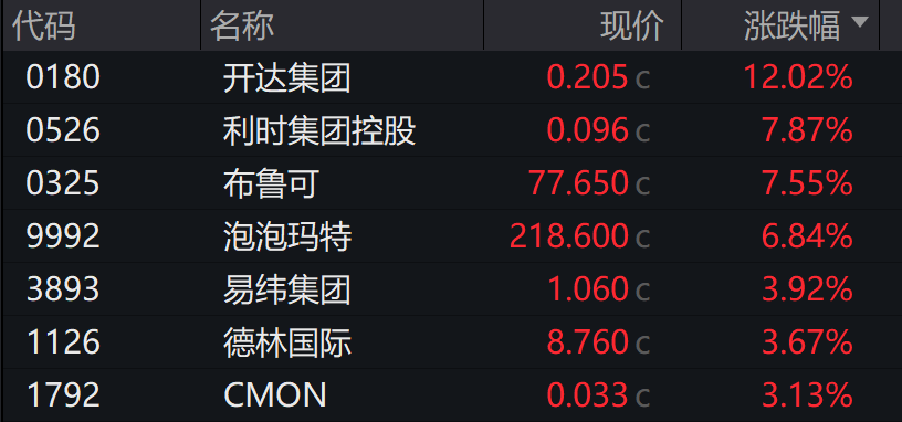 港股消费板爆发,开达集团涨12.02%,泡泡玛特涨6.84%。