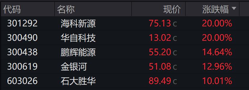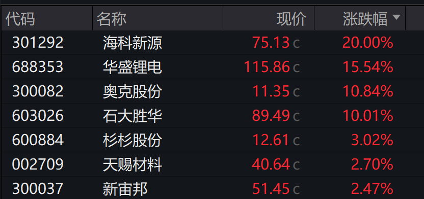 华自科技海科新源20%涨停,鹏辉能源华盛锂电金银河奥克股份涨超10%,石大胜华封板。