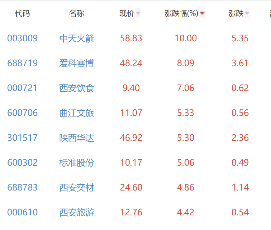 A股陕西板块午后拉升,中天火箭涨停,西安饮食涨7.06%,西安旅游天地源曲江文旅陕西华达广电网络标准股份跟涨。