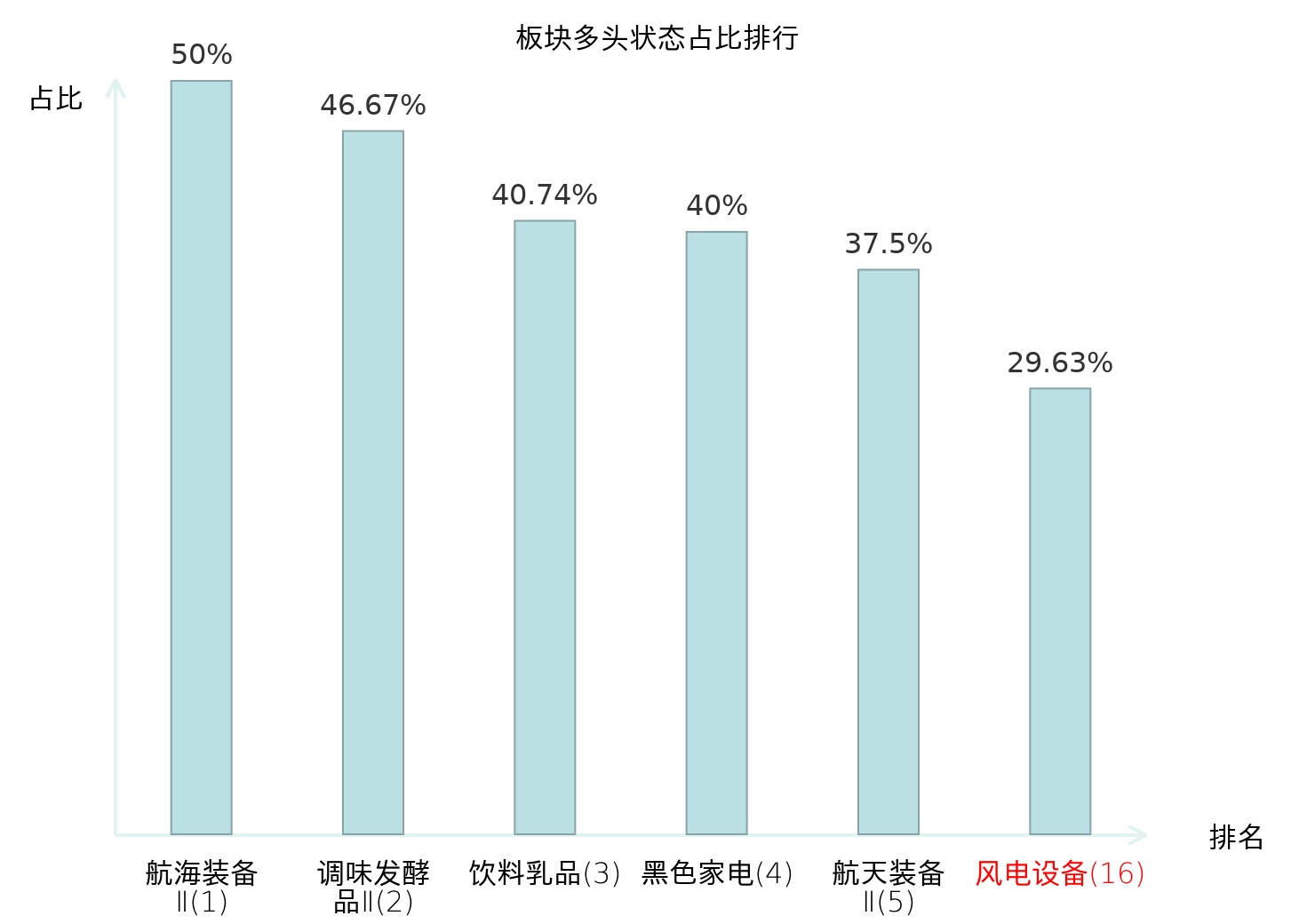 全市场所有行业板块中主力多头状态占比排名中,航海装备Ⅱ板块位居第一。航海装备Ⅱ板块名次提升最快,较昨日上升99位。