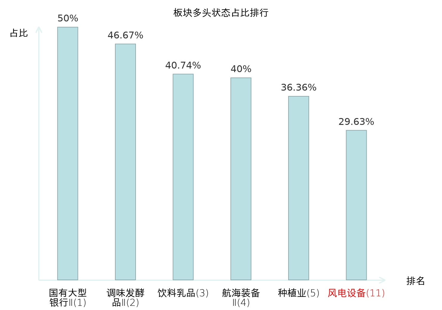 全市场所有行业板块中主力多头状态占比排名中,国有大型银行Ⅱ板块位居第一。金属新材料板块名次提升最快,较昨日上升71位。