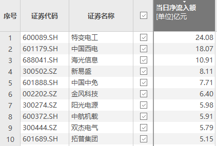 资金风向标 | 特变电工获资金净流入24.08亿元