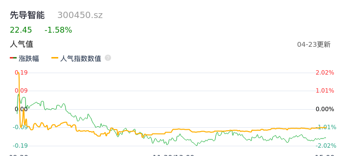 04月23日,先导智能收报22.45,股价涨幅-1.58%,成交金额3.82亿元,换手率1.17%。