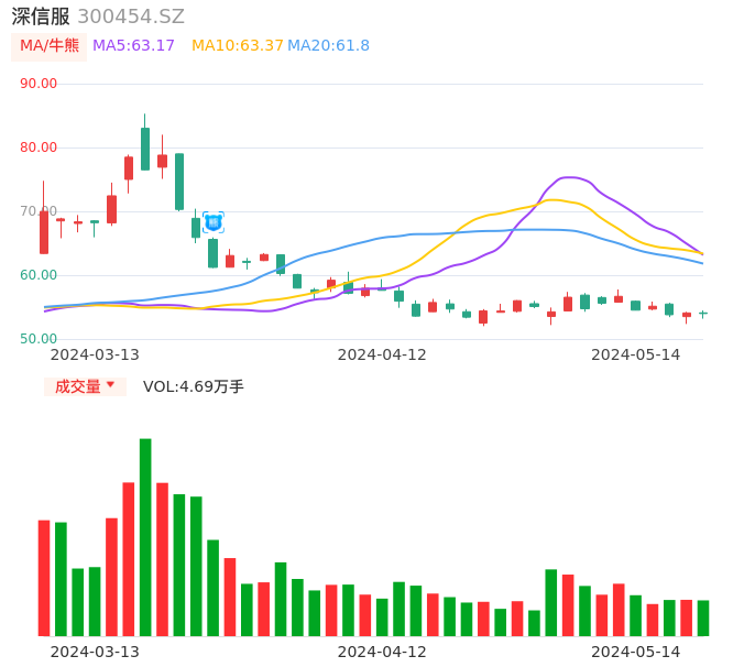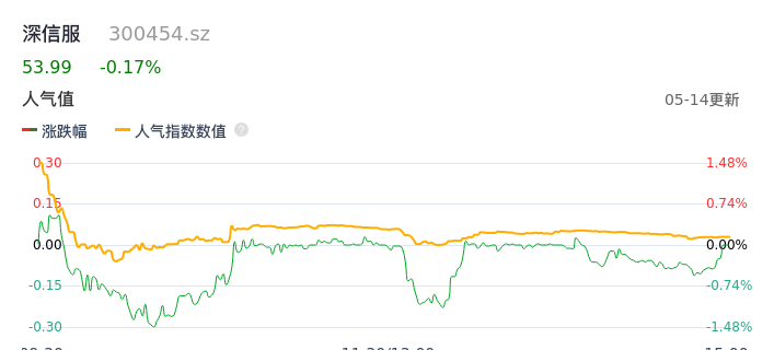 05月14日,深信服收报53.99,股价涨幅-0.17%,成交金额2.53亿元,换手率1.70%。