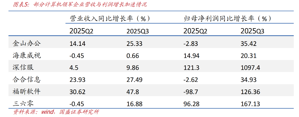 根据国盛证券的研究报告,多家计算机领军企业在2025年第三季度的业绩表现优异,增长显著提速。报告数据显示,金山办公海康威视深信服合合信息等公司,其单季度营收或归母净利润同比增长率相较二季度均有明显提升。以金山办公为例,其25Q3归母净利润同比增长高达35.42%,远超Q2的-2.83%,主要得益于AI新产品的落地推广和信创业务的加速。这表明,对于具备核心竞争力和强大执行力的公司而言,AI非但不是“吞噬者”,反而成为驱动增长的“赋能者”。
