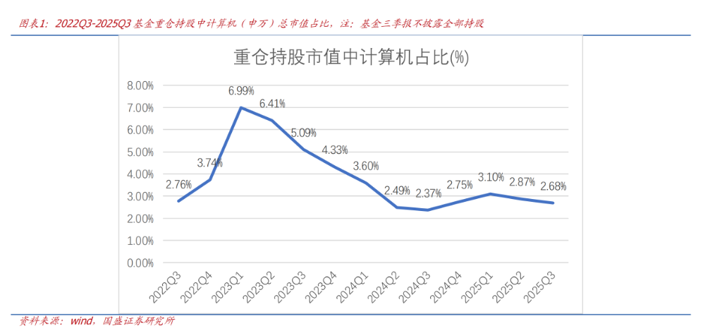从资金配置角度看,软件行业正处于一个有利的起点。据基金三季报重仓持股数据显示,2025Q3基金重仓持股总市值中,计算机板块占比仅为2.68%,处于近年来的相对低位,且已连续两个季度下降。与此同时,年初至今该行业的涨幅也落后于通信、电子等其他科技板块。