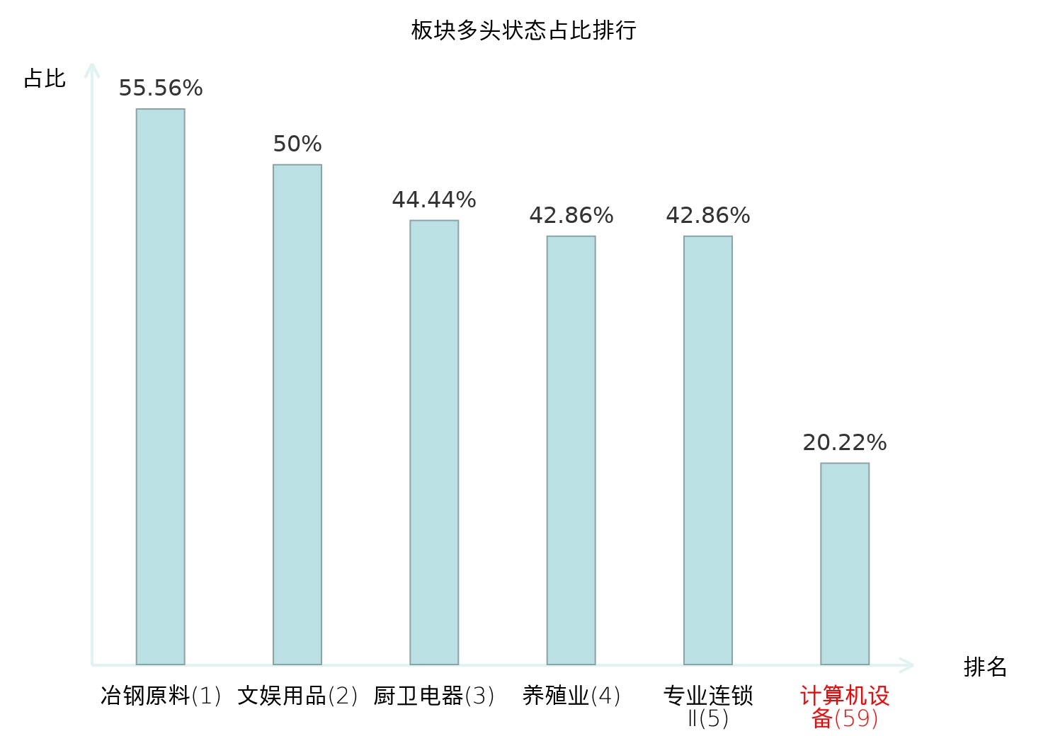 全市场所有行业板块中主力多头状态占比排名中,冶钢原料板块位居第一。能源金属板块名次提升最快,较昨日上升48位。