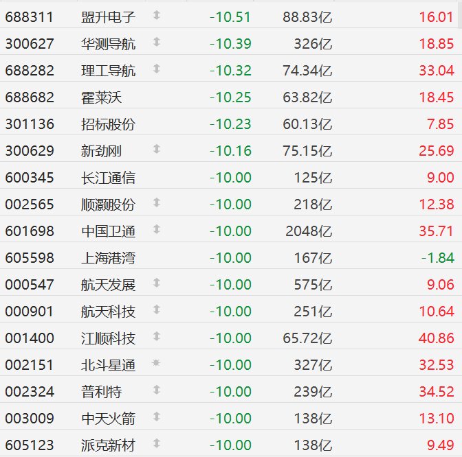 格隆汇1月13日|A股市场此前强势的商业航天股今日大面积跌停,其中,航天环宇、邵阳液压跌超14%,铂力特、航天智装、国科军工、广联航空、斯瑞新材、航天宏图跌超12%,坤恒顺维、富士达、久之洋、航天软件跌超11%,天力复合、海昌新材、瑞华泰、震有科技、航宇科技、盟升电子、华测导航、理工导航跌超10%,长江通信、顺灏股份、中国卫通、上海港湾、航天发展、北斗星通、中天火箭等10CM跌停。
