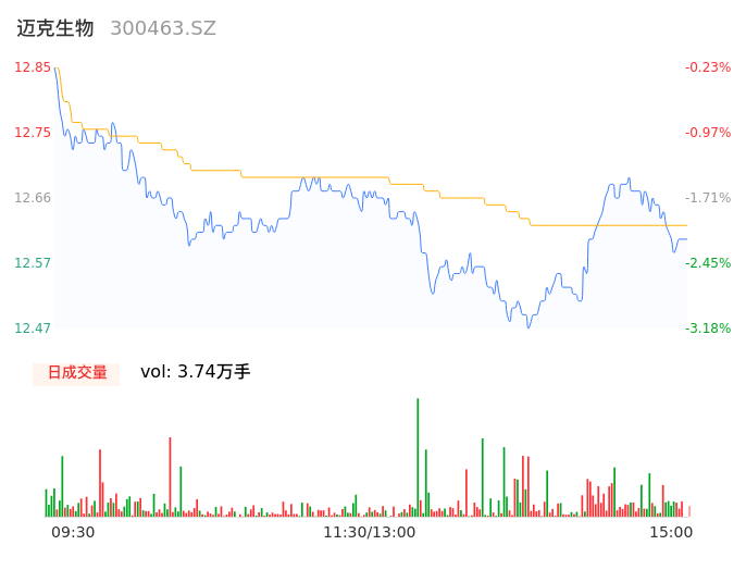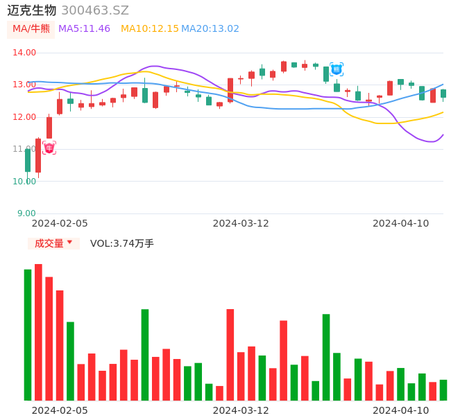 04月10日,迈克生物收报12.61,股价涨幅-2.10%,成交金额4716.03万元,换手率0.75%。