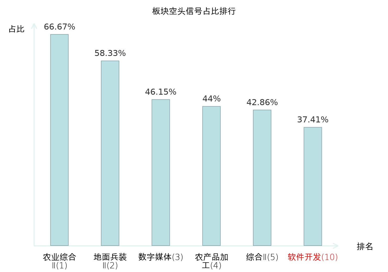 全市场所有行业板块中主力空头信号占比排名中,农业综合Ⅱ板块位居第一。医药商业板块名次提升最快,较昨日上升121位。