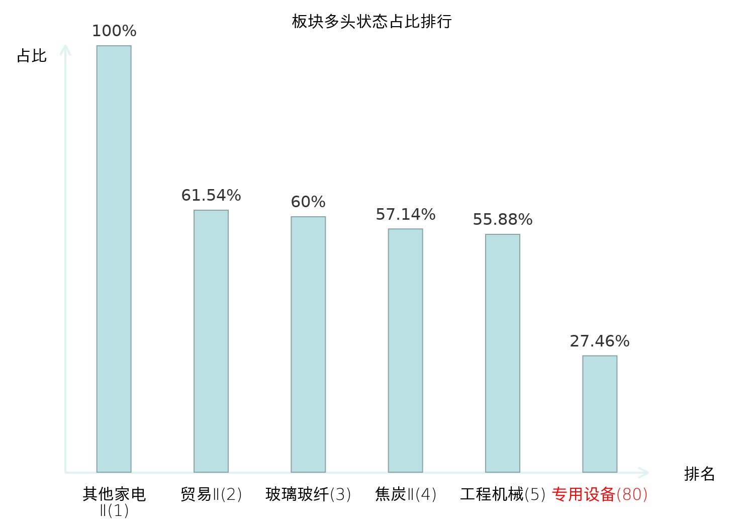 全市场所有行业板块中主力多头状态占比排名中,其他家电Ⅱ板块位居第一。航海装备Ⅱ板块名次提升最快,较昨日上升98位。