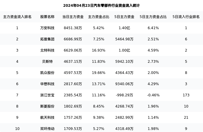 从主力资金流向来看,汽车零部件行业今日主力资金流入66.61亿元,在所有申万二级行业中排名:38/131。