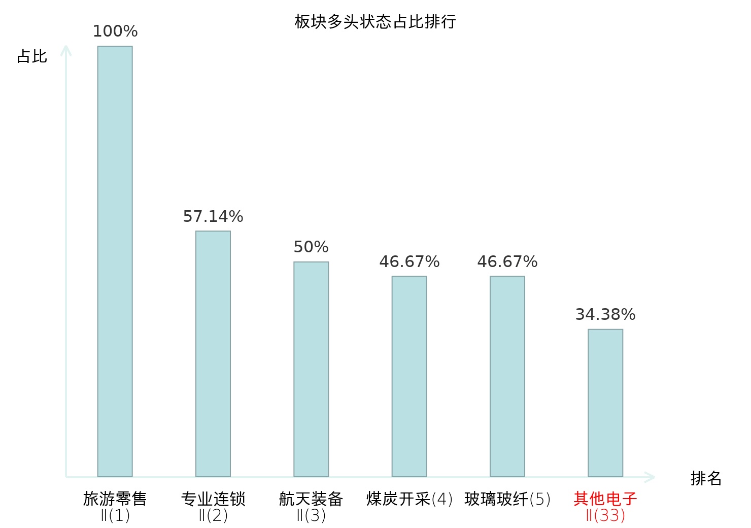 全市场所有行业板块中主力多头状态占比排名中,旅游零售Ⅱ板块位居第一。普钢板块名次提升最快,较昨日上升64位。