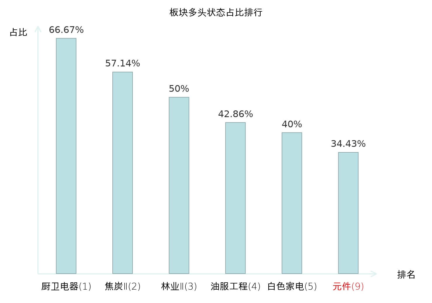 全市场所有行业板块中主力多头状态占比排名中,厨卫电器板块位居第一。风电设备板块名次提升最快,较昨日上升98位。