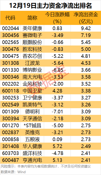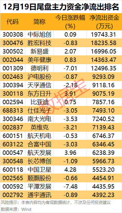 据数据宝统计,中际旭创、胜宏科技、新易盛、美年健康、德明利等个股尾盘主力资金净流出居前。